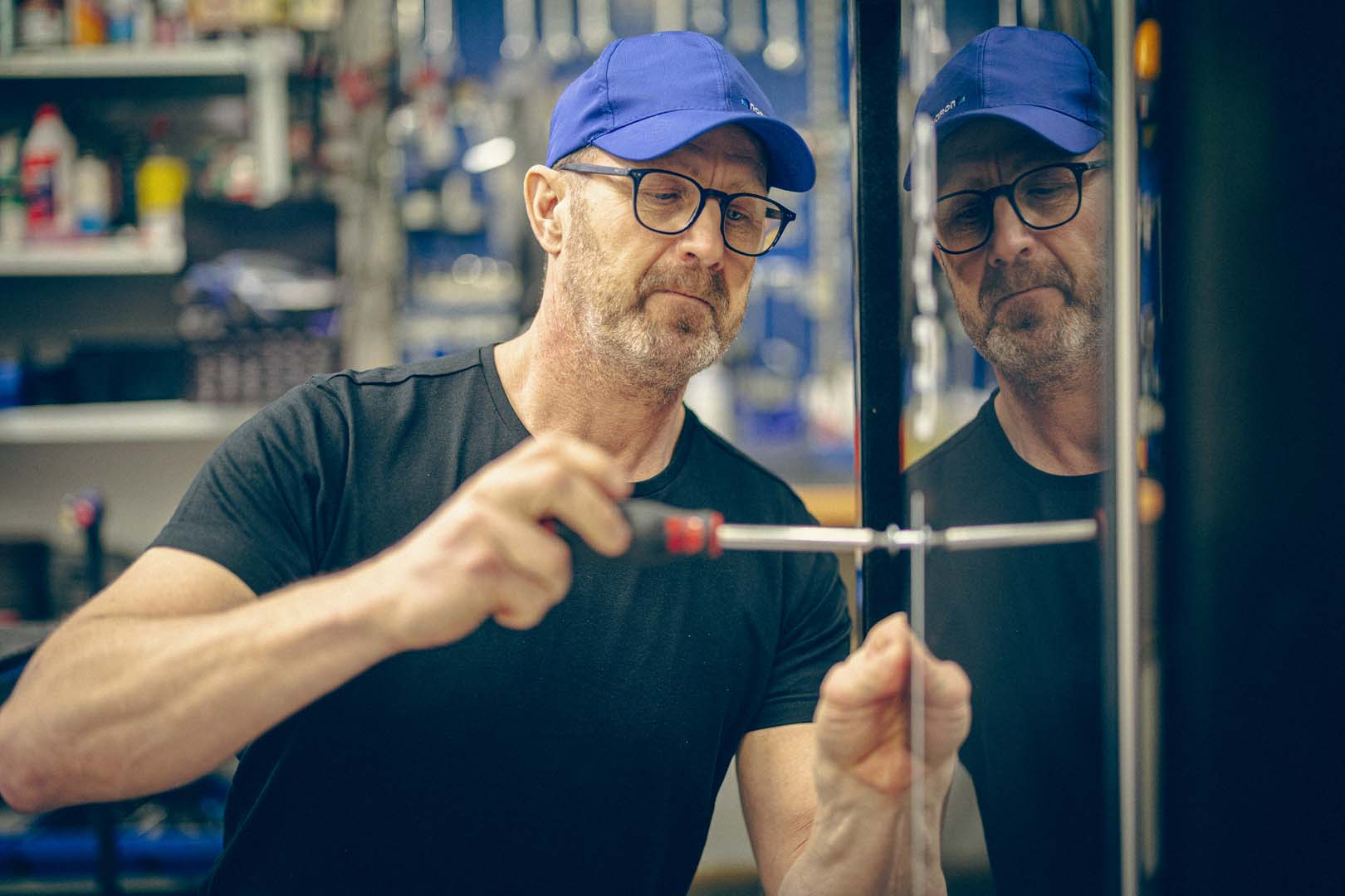 Nordic Gyms riksomfattande service består av nio personer med ansvar för service, eftermarknad, installation, lager, leverans, tapetsering (dynor), och verkstad.